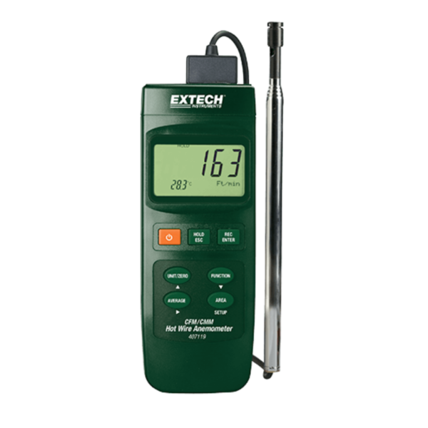 The 407119 Heavy Duty CFM Hot Wire Thermo–Anemometer uses a telescoping probe (extends up to 3 ft) which is ideal for use in ducts and ventilating systems. It can accurately measure Air Flow (CFM/CMM), Air Velocity and Temperature. Air Flow can be displayed as an instantaneous value or up to a 20 point average. Additional functions include Data Hold, Min/Max, and Auto power off. Comes complete with telescoping probe with 5.5ft cable, and 4 x AA batteries.