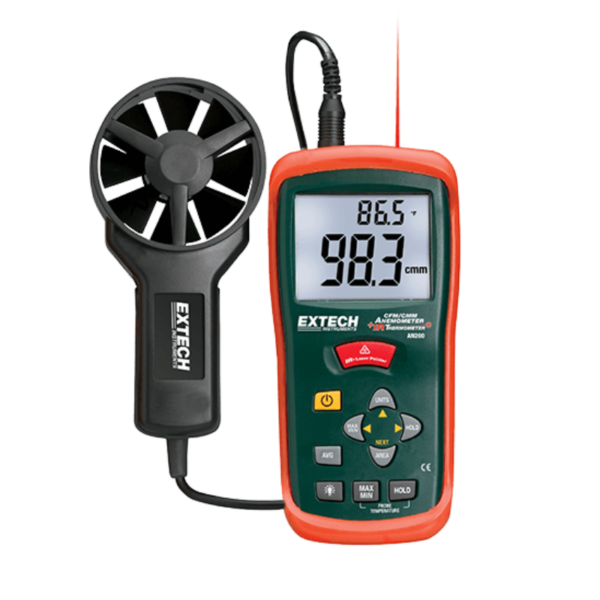 AN200 is a CFM/CMM Mini Thermo-Anemometer with built-in InfraRed Thermometer. Built-in non-contact IR Thermometer measures remote surface temperatures to 500°F (260°C) with 8:1 distance to spot ratio and Laser Pointer. This CFM/CMM Thermo-Anemometer can simultaneously display of Air Flow or Air Velocity plus Ambient Temperature. Easy to set area dimensions (ft² or m²) are stored in the meter’s internal memory for the next power on. Additional features include: 20 point average for Air Flow and 3% velocity accuracy via low friction 2.83 in.D (72mm) ball bearing vane wheel on 3.9ft (120cm) cable. Comes complete with 9-Volt battery, protective rubber holster, and case.