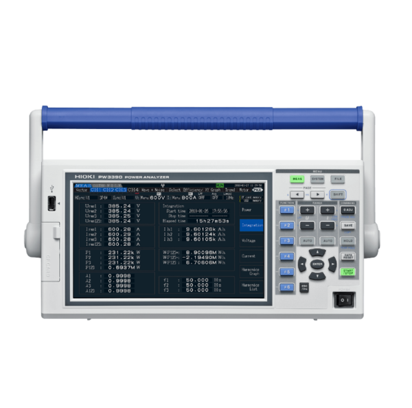 Hioki benchtop power meters and power analyzers are best in class power measuring instruments for measuring single to three-phase lines with a high degree of precision and accuracy. The PW3390 is a high-precision, broad-range power analyzer for measuring electrical power from DC to inverter frequencies, providing four input channels to support single- and three-phase inverter motor systems up to 4000 A AC/DC with superior accuracy. High-accuracy, high-speed calculation of transient-state power in 50 ms; harmonic analysis; display of instantaneous waveforms; noise analysis; and simultaneous parallel calculation of all parameters, including efficiency loss